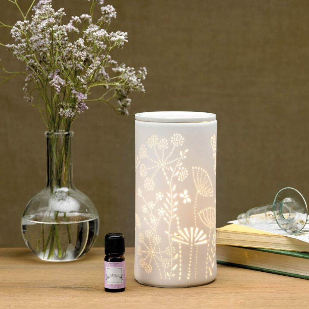 In Botanical Garden un delizioso giardino botanico ricco di particolari emerge dalla ceramica traforata dalla quale una volta acceso il diffusore si diffondono suggestivi giochi di luce