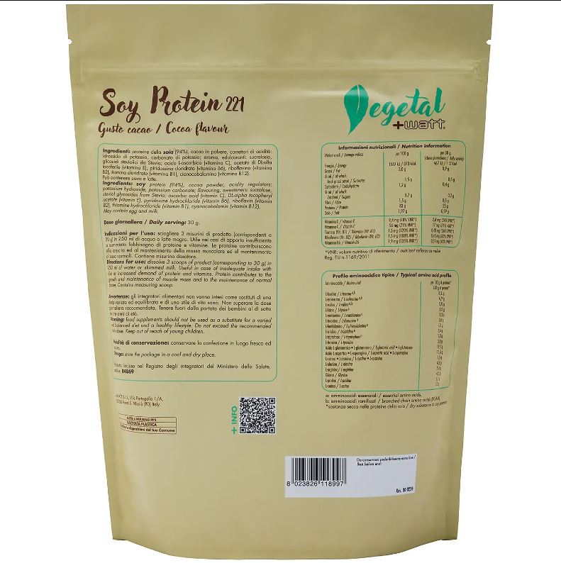 proteine dellaย soiaย 94%, cacao magro in polvere, aromi, edulcoranti: sucralosio, glicosidi steviolici (estratti da foglie di Stevia rebaudiana Bertoni); acido L-ascorbico (vitamina C), DL-alfa tocoferolo acetato (vitamina E), piridossina HCl (vitamina B6), riboflavina (vitamina B2), tiamina HCl (vitamina B1), cianocobalamina (vitamina B12). Il prodotto potrebbe contenereย latte e uovo.